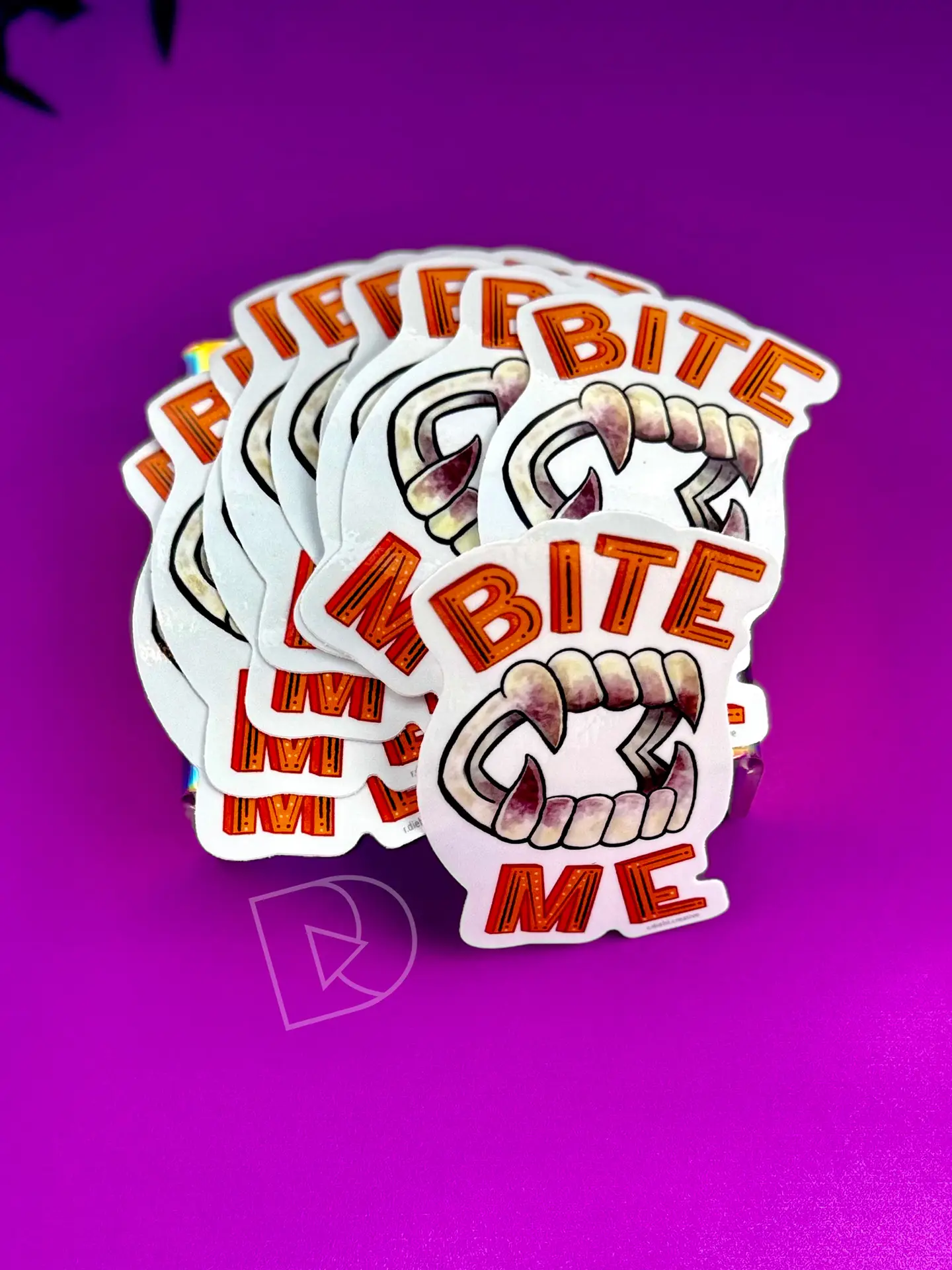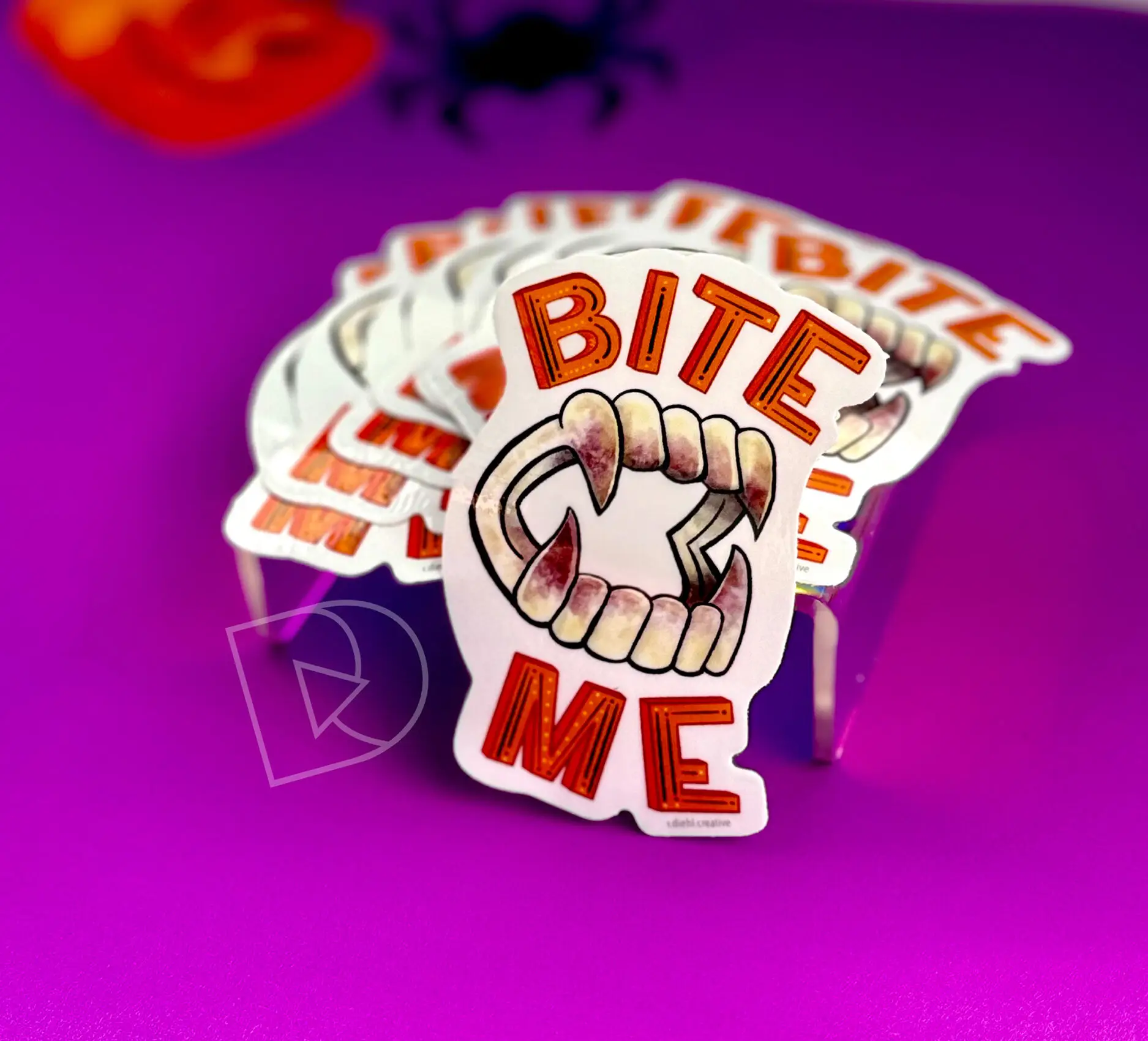 Oh, bite me! This Vampire Fangs Sticker features a scary sharp set of play vampire teeth with the phrase ‘Bite Me’ hand-lettered around it. This creepy & cheeky sticker is the perfect addition to any growing halloween or gothic collection. Printed on signature ‘Bombproof’ material from ‘The Sticky Brand’, these stickers are made from thick, durable vinyl that protects from scratches, water and sunlight.